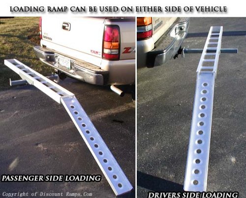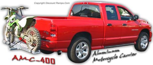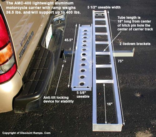 Want to haul your motorcycle or scooter but dont want the problems of pulling a trailer. The AMC-400 motorcycle and scooter carrier is just what you are looking for. This motorcycle carrier is designed for motocross bikes, scooters and off road dirt bikes with up to 5 1/2" wide tires and will fit motorcycles and scooters up to 75 inches long. This motorcycle carrier also includes a lightweight aluminum loading ramp for loading your cycle on the carrier and it conveniently attaches on the carrier next to the carrier track for transport. This motorcycle hitch carrier has a carrying capacity of 400 lbs. so please check your vehicles hitch rating as well as the suspension carrying capability of the carrying vehicle. This unit works great for RV's, campers, pick up trucks, vans and SUV's.