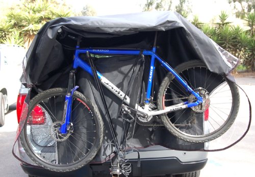 A super quality 2 bike cover for all popular racks. Unique design allows 2 covers to be connected for a 4 bike total capacity. 84L x 54H at front and 42H at rear. Heavy duty zippers and rugged construction will hold up to miles of car or RV travel. Check with your rack manufacturer about their policy on covering bikes while rack mounted.